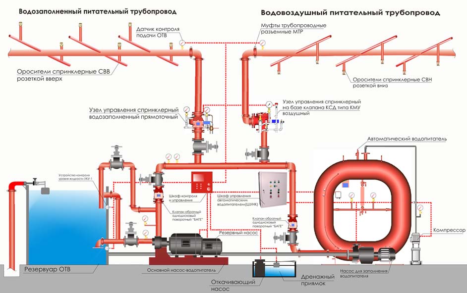 При возникновении локального возгорания в помещении срабатывает один или несколько оросителей, находящихся в зоне повышенной температуры. В обычном отапливаемом здании трубопроводы, к которым подключены все оросители, постоянно заполнены водой, находящейся под давлением. Его обеспечивает автоматика, и в случае возгорания она дает сигнал на узлы управления или насосы, которые для поддержания давления начинают качать воду из водопроводной сети или пожарной емкости.